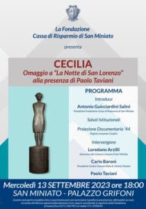 Mercoledì 13 settembre 2023, alle ore 18:00 presso Palazzo Grifoni a San Miniato (PI), la Fondazione Cassa di Risparmio di San Miniato si pregia di presentare al pubblico un’importante scultura dal titolo “Cecilia – Omaggio a La Notte di San Lorenzo”.