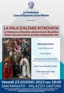 Venerdì 23 giugno 2023, alle ore 18:00 presso Palazzo Grifoni a San Miniato (PI), la Fondazione Cassa di Risparmio di San Miniato si pregia di presentare al pubblico un’importante opera d’arte: una Pala d’Altare di grande dimensioni (204 x 145 cm) raffigurante La Madonna col Bambino adorata da San Baudolino d’Asti e Giovanni Oldrati da Meda di Benedetto Veli.