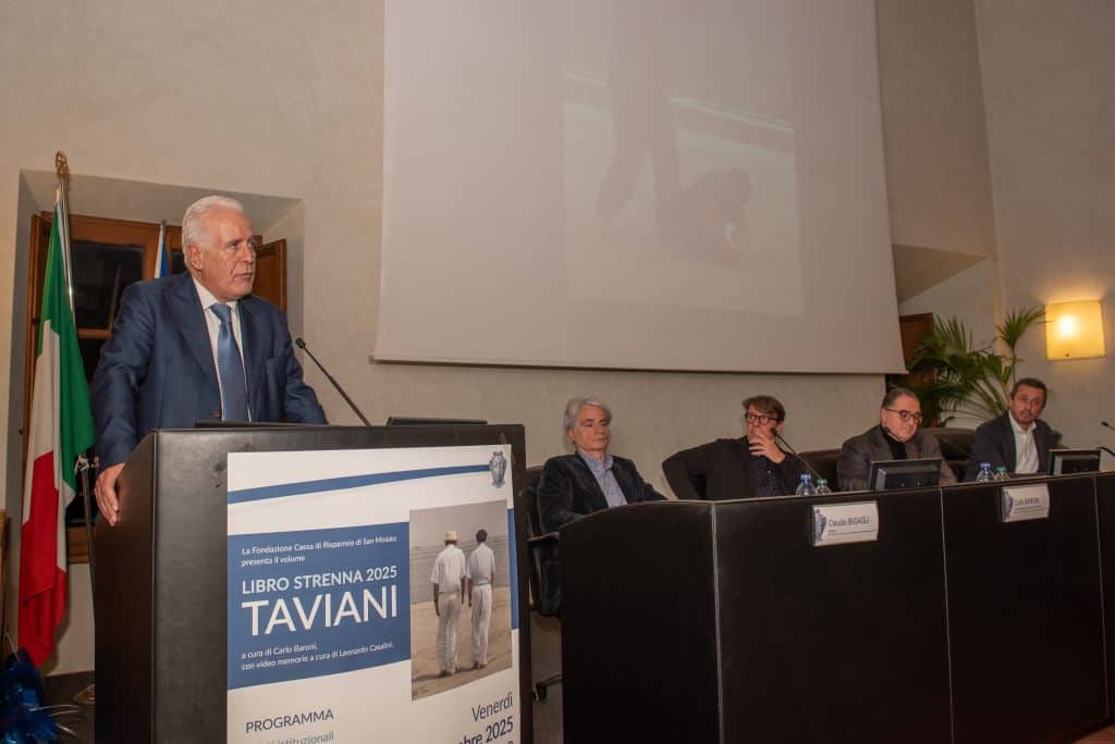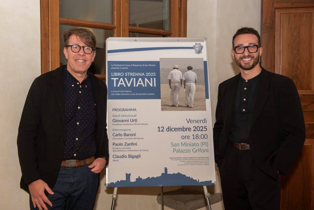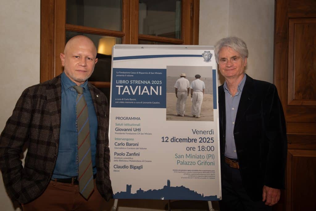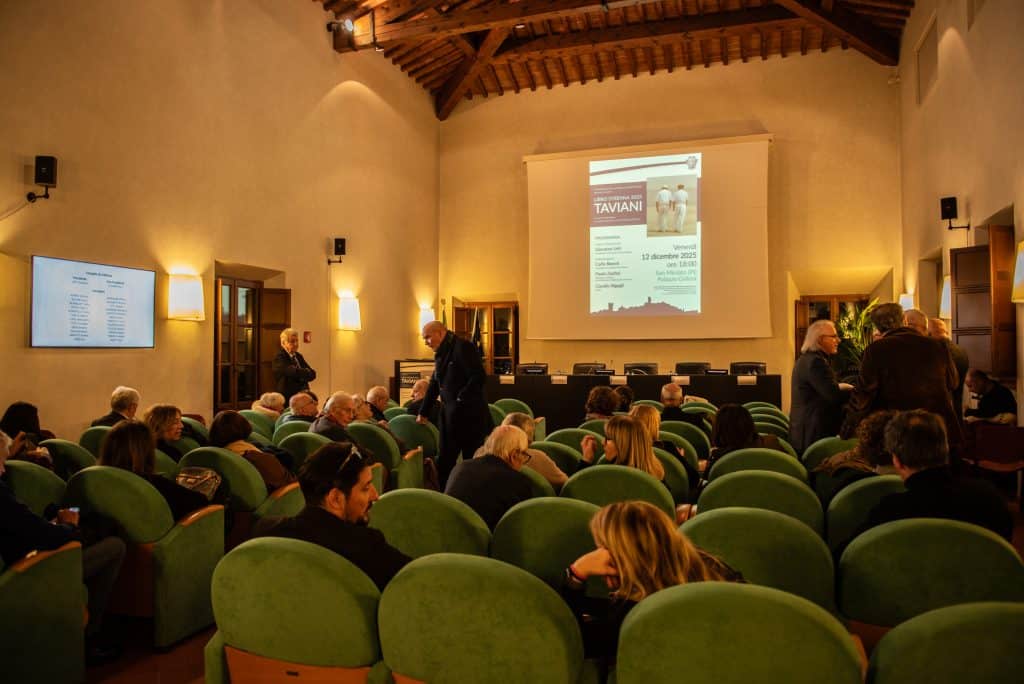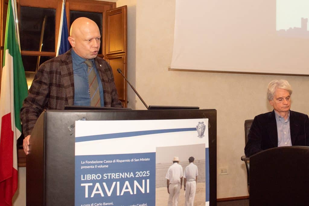 Si è tenuta venerdì 12 dicembre 2025 alle ore 18:00 a Palazzo Grifoni la presentazione del Libro Strenna 2025 “TAVIANI” a cura di Carlo Baroni con video memorie a cura di Leonardo Casalini. L’evento, introdotto dal Presidente della Fondazione CR San Miniato, Giovanni Urti, si è svolto in presenza di Carlo Baroni, giornalista e curatore del volume, Paolo Zanfini, Direttore scientifico della Biblioteca Malatestiana di Cesena e, Claudio Bigagli, attore.