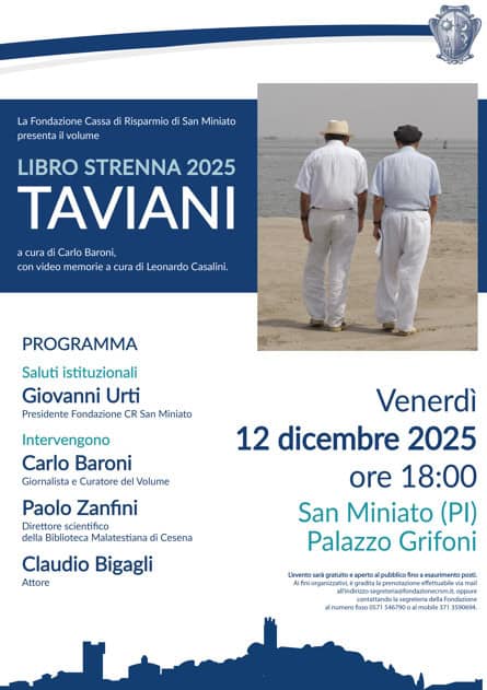 Venerdì 12 dicembre 2025, alle ore 18:00 presso Palazzo Grifoni a San Miniato (PI), la Fondazione Cassa di Risparmio di San Miniato presenterà il Libro Strenna 2025 “TAVIANI”, a cura di Carlo Baroni con video memorie a cura di Leonardo Casalini. Introduce il Presidente della Fondazione CR San Miniato, Giovanni Urti. Interverranno Carlo Baroni, giornalista e curatore del volume, Paolo Zanfini, Direttore scientifico della Biblioteca Malatestiana di Cesena e, Claudio Bigagli, attore.