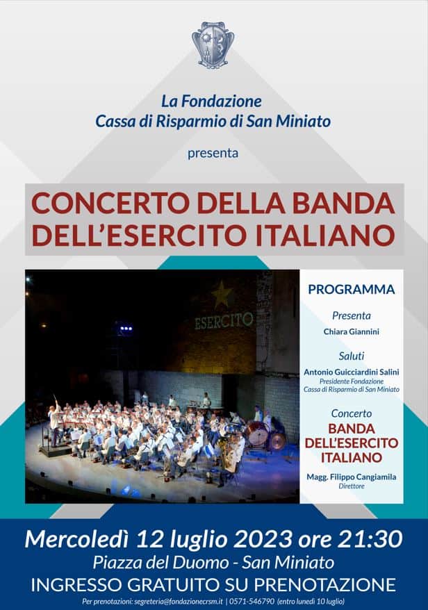 La Fondazione Cassa di Risparmio di San Miniato è lieta di presentare l’evento “Concerto della Banda dell’Esercito Italiano”, che avrà luogo mercoledì 12 luglio 2023 alle ore 21:30 presso Piazza Duomo a San Miniato (PI).
