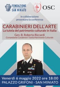 Ospite d’eccezione il Generale di Brigata Roberto Riccardi, Comandante dei Carabinieri per la Tutela del Patrimonio Culturale. La conferenza si aprirà con i saluti del Presidente della Fondazione CR San Miniato, Antonio Guicciardini Salini, del Presidente dell’Ass. OSC, Valerio Martinelli, del Vescovo di San Miniato, Mons. Andrea Migliavacca, e sarà moderata da Piero Fachin, vicedirettore del quotidiano La Nazione.