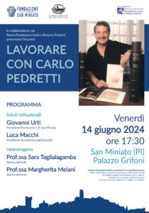 Venerdì 14 giugno 2024, alle ore 17:30 presso Palazzo Grifoni a San Miniato (PI), la Fondazione Cassa di Risparmio di San Minato e l’Accademia degli Euteleti della Città di San Miniato, in collaborazione con la Nuova Fondazione Carlo e Rossana Pedretti presentano l’incontro “LAVORARE CON CARLO PEDRETTI”.