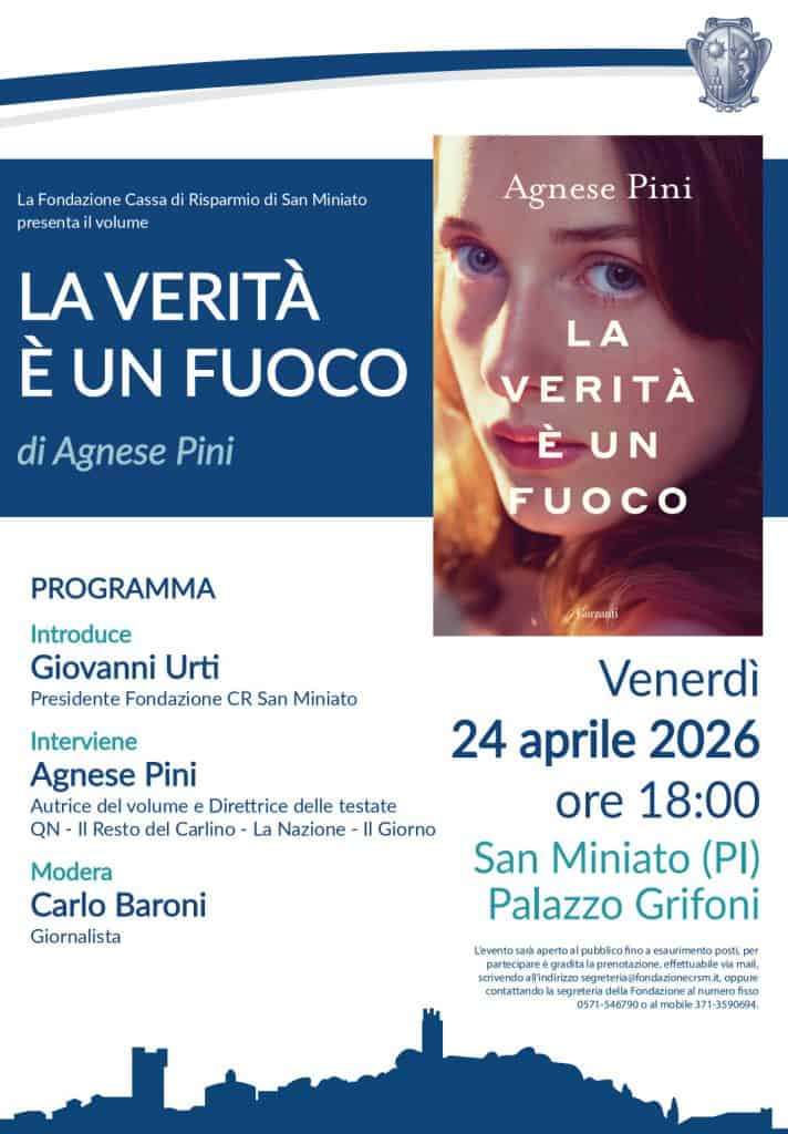 Nell’ambito dell’attività di promozione culturale, venerdì 24 aprile 2026 alle ore 18:00, presso Palazzo Grifoni a San Miniato (PI), la Fondazione Cassa di Risparmio di San Miniato ospiterà la presentazione del volume “La verità è un fuoco“ di Agnese Pini. Un’opera che con uno stile intimo e coraggioso, trasforma una vicenda personale in un racconto universale, offrendo al lettore uno sguardo autentico e profondo sul significato dell’essere figli e genitori nella società contemporanea.