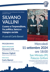 Mercoledì 11 settembre 2024, alle ore 18:00 presso Palazzo Grifoni a San Miniato (PI), in occasione dei cent’anni dalla nascita, la Fondazione Cassa di Risparmio di San Miniato presenterà il volume “SILVANO VALLINI. L’uomo e l’imprenditore, fra politica, banca e impegno sociale”, a cura di Carlo Baroni.