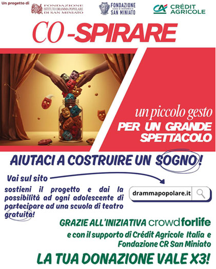 Continua la raccolta per il progetto della Fondazione Istituto Dramma Popolare di San Miniato: scuola di teatro CO-SPIRARE, gratuito per ragazze e ragazzi dai 14 ai 19 anni del territorio. L’iniziativa vede la partecipazione attiva di Fondazione CR San Miniato e Crédit Agricole Italia che replicheranno a loro volta i contributi che perverranno dalle persone fisiche e dalle imprese. Sostieni anche tu CO-SPIRARE: insieme possiamo far respirare il teatro, la comunità e il futuro delle ragazze e ragazzi.