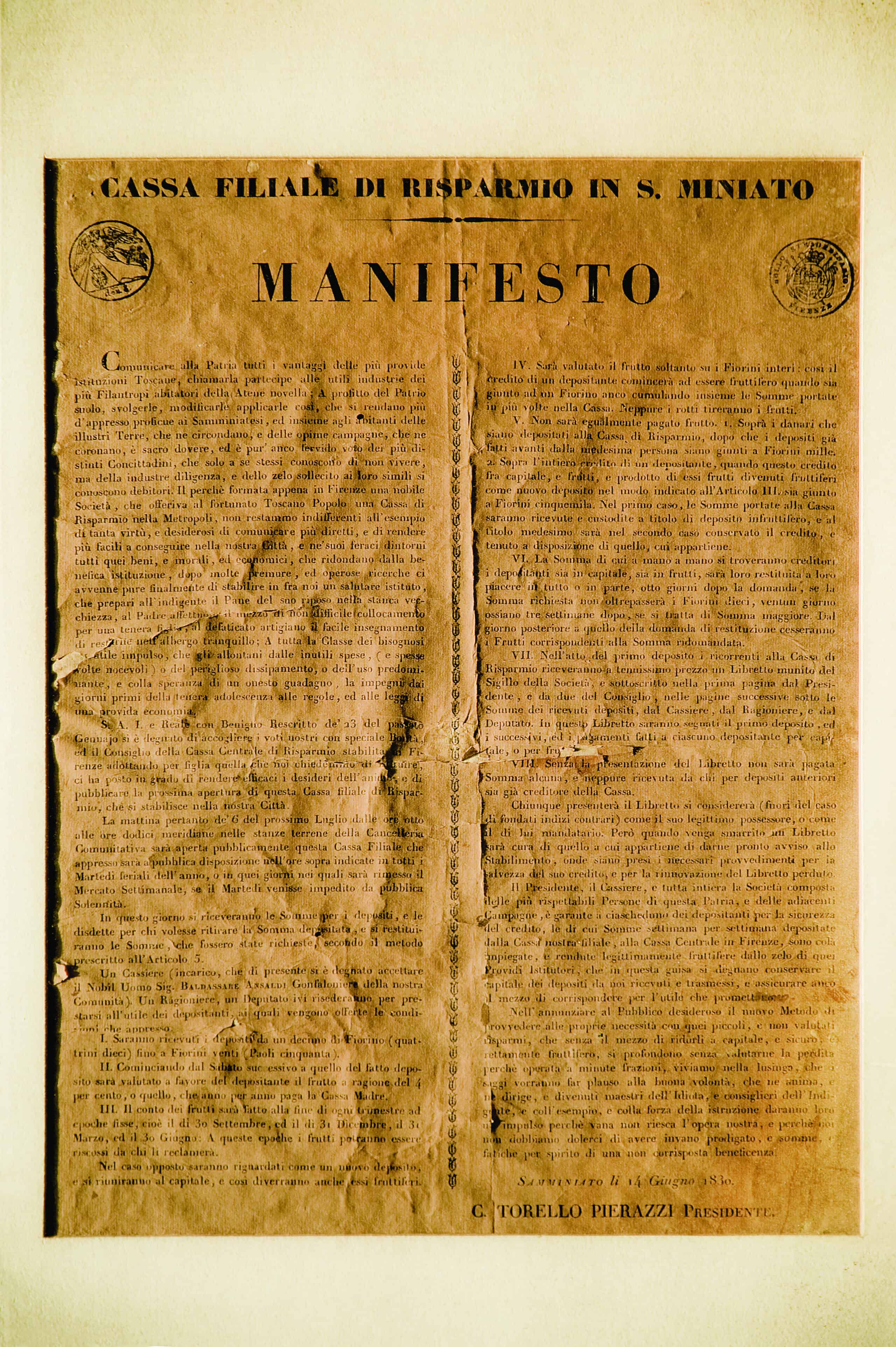 Il 27 aprile 1830, nel palazzo comunale, si adunarono in assemblea i detti cittadini fondatori e dichiararono di costituirsi in società anonima. Veniva così fondata la Cassa di Risparmio di San Miniato, fra le più antiche Casse Toscane. Venne allora pubblicato dal presidente Monsignor Torello Pierazzi un manifesto con il quale si avvisava la popolazione dell’apertura della Cassa, si davano norme per il funzionamento dell’Istituto e si diceva che la sua funzione era quella di favorire nel territorio la formazione del risparmio familiare per ogni classe di cittadini. Da allora la storia della Cassa di Risparmio di San Miniato si è intrecciata in modo indissolubile con il proprio territorio di riferimento, accompagnando le vicende dello sviluppo sociale ed economico.